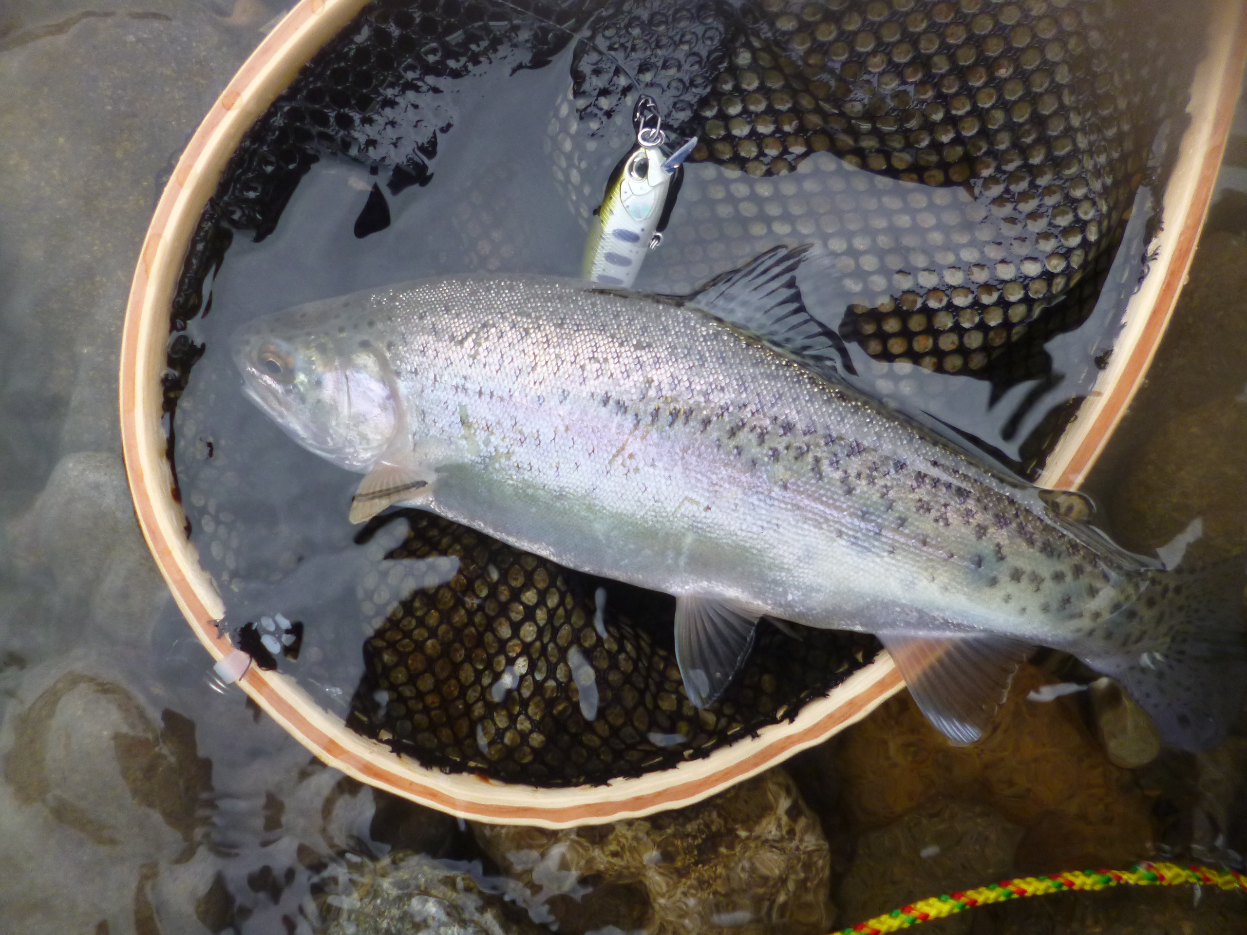 ルアーが根掛かりしたかと思うほど重くて動きません しかし強くあわせるといきなり銀色の魚体がジャンプしました。その大きさに 最初は鮭が釣れたのかと思ったほどです。慎重にやり取りをしながら10分ぐらいでしょうか、動きが遅くなったところを見計らって ネットインしました。ネットが小さすぎて魚体は半分以上はみだしていました。55cmの虹鱒でした 自己新記録のサイズです。