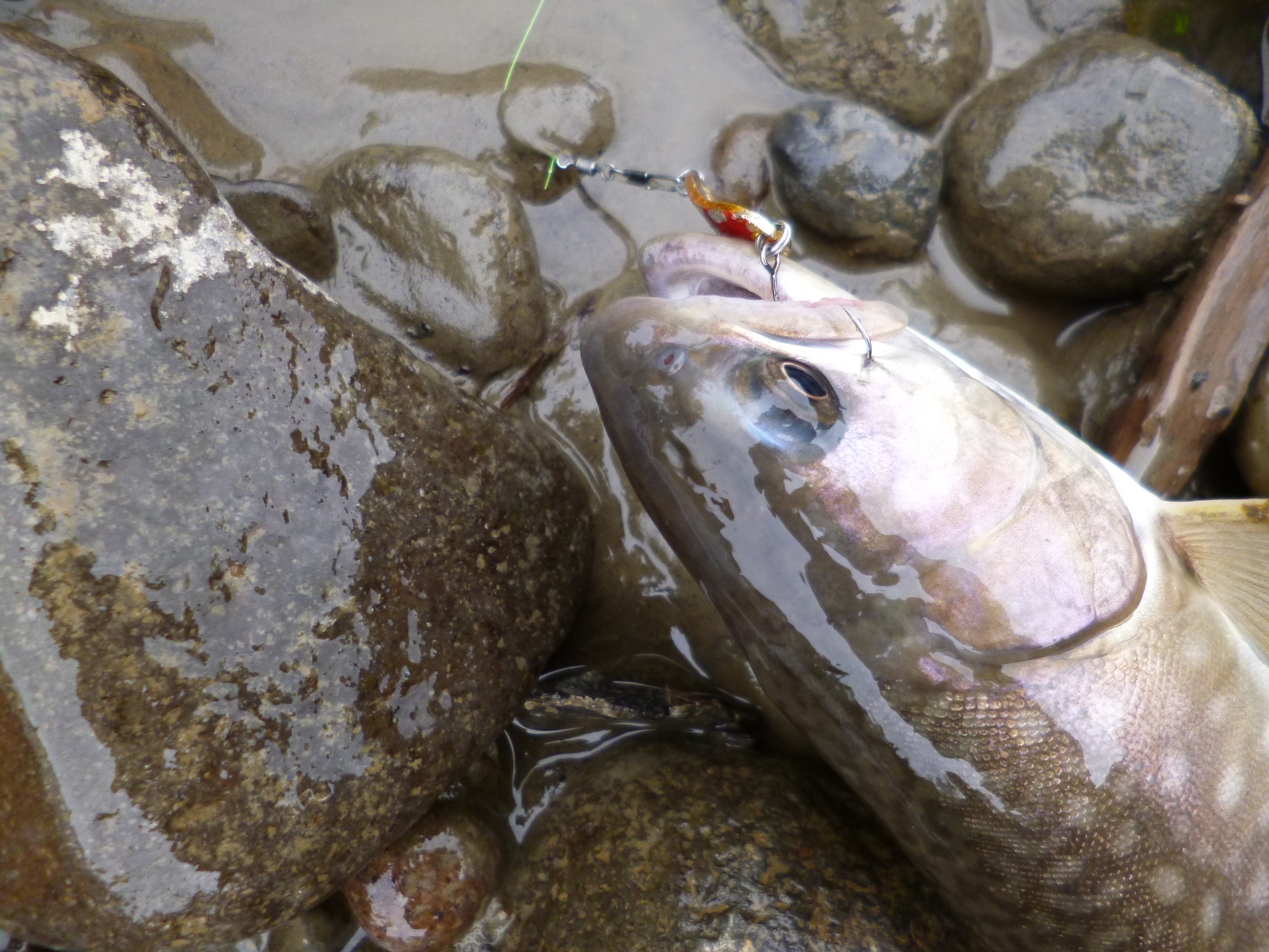 - 砂防ダムの落ち込みでキャスティングしました。強い引きがありなかなか寄ってきません。それでも慎重に手繰り寄せて ランディング 43cmのアメマスでした。