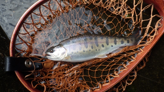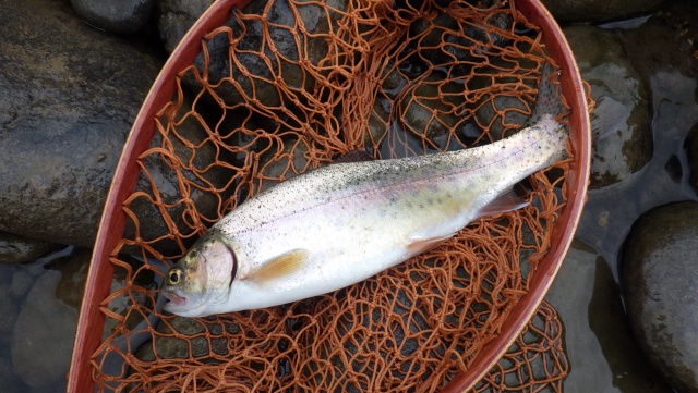 - 珍しくニジマスが二匹ヒットしました。その他は10cm程のピン子山女魚がおよそ20匹ぐらい釣れました。#8のウェットフライに果敢に食いついてきます。サイズ変更してドライに変えればもっと釣れたかもしれませんが、あくまで良型狙いなのですぐリリースします。まとまった雨が降らないとしばらく釣りにならないかもしれません。