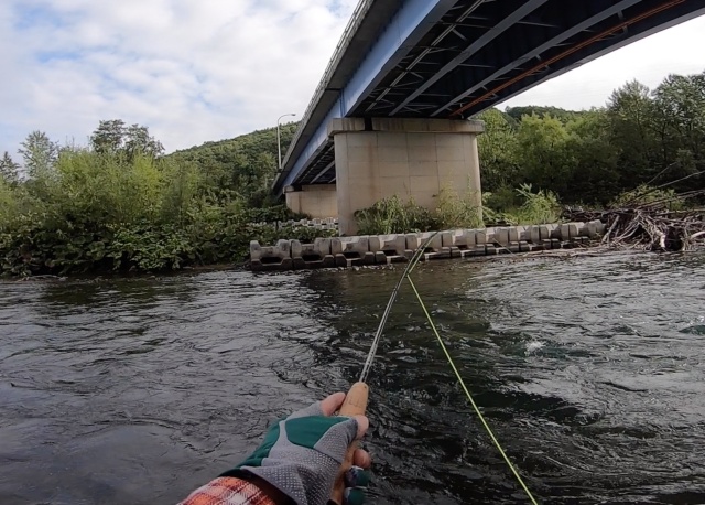- 毎回大物の居るポイントを狙っていますが最近はアタリすら無いので今日はキャストの位置を変更しフライもストーンフライ#8に変えてみました。大物が潜んでいる倒木の下辺りを根掛かり覚悟でギリギリまで流しているとずっしりとした重量感がロッド全体に掛かって明らかに大物だとわかる奴がヒットしました。前回ラインブレークされているので今回は強く合わせず相手の動きに合わせましたが以外にも強く引き込まれることもなくラインを手繰るとじわりじわりと寄せることが出来ます。派手に暴れることもなく素直に寄ってきますがそれでもその重量感から大物には間違いない様です。さてどうしょうか?うまく取り込めるかな?流れに立ち込んでいるのでネットインは難しいと考え岸近くまで引き込もうとしたその時、ググーンと大きく首を降ってフックが外されてしまいました。おそらく釣り慣れた相当な強者でしょう。完敗でした。