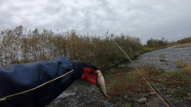 - 出発した朝7時の気温は2度で10時になっても6度にしか上がらずどんよりした曇り空でとても寒い釣行でした。ある程度防寒の準備はして行ったけど時間と共に芯から冷えてきてしまい雨も降ってきたので早めに切り上げました。ニジマスは全く釣れず小型山女魚5〜6匹でした。この時期水温も下がりニジマスは移動してしまったのか必ず釣れるポイントでもアタリすら有りませんでした。